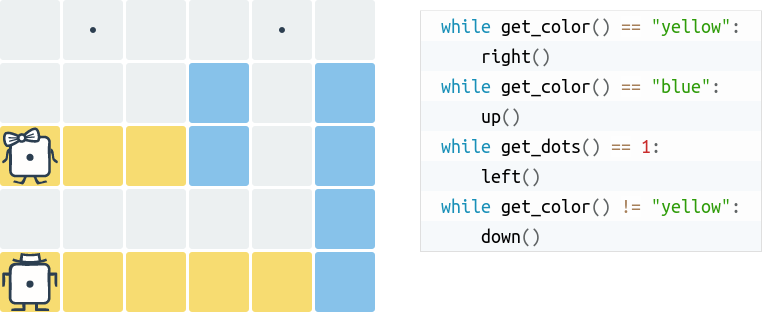 Dla zupełnie początkujących polecamy na rozgrzewkę zadania z sekcji myślenie algorytmiczne, gdzie podstawowe koncepcje programowania można poznać w formie graficznej.